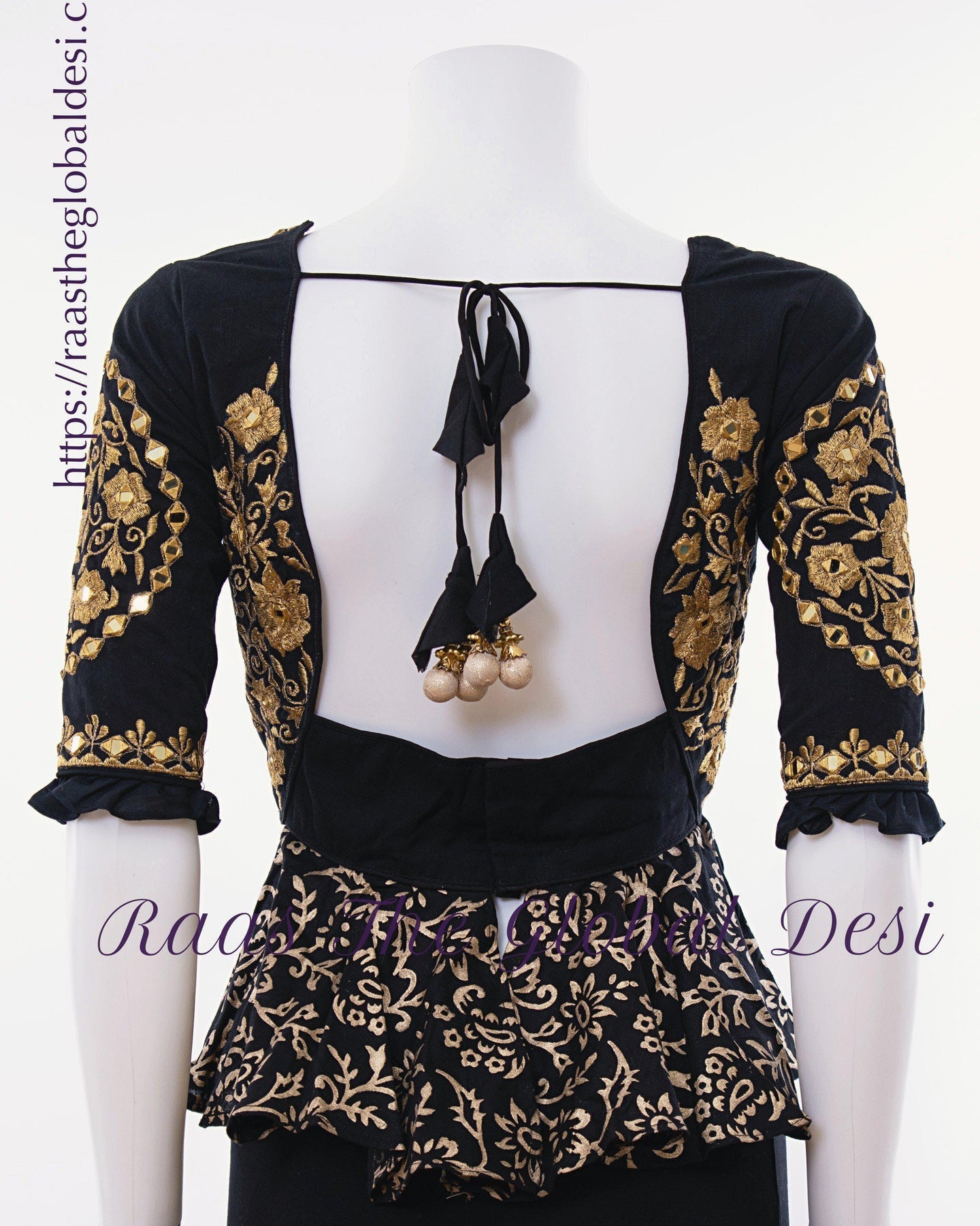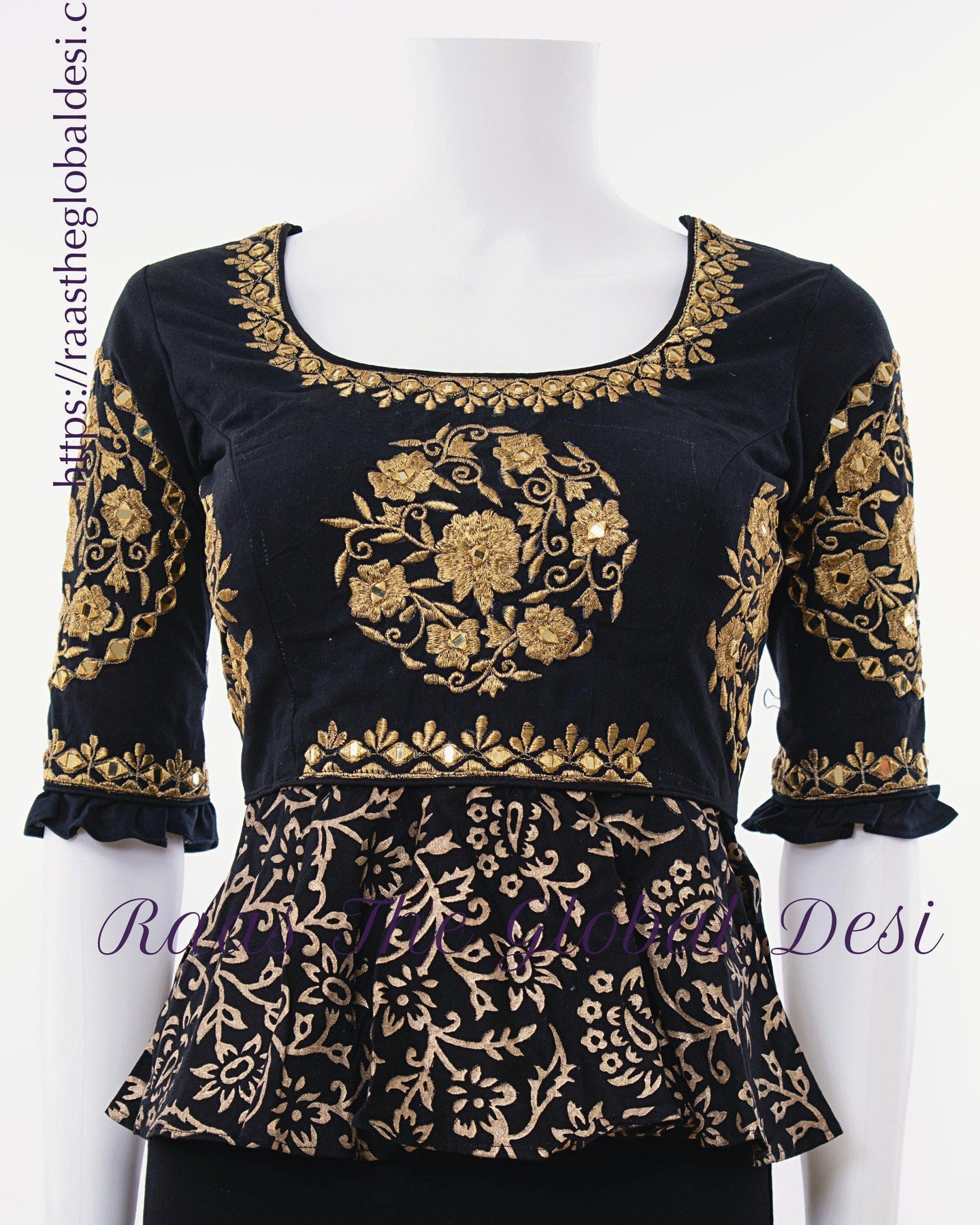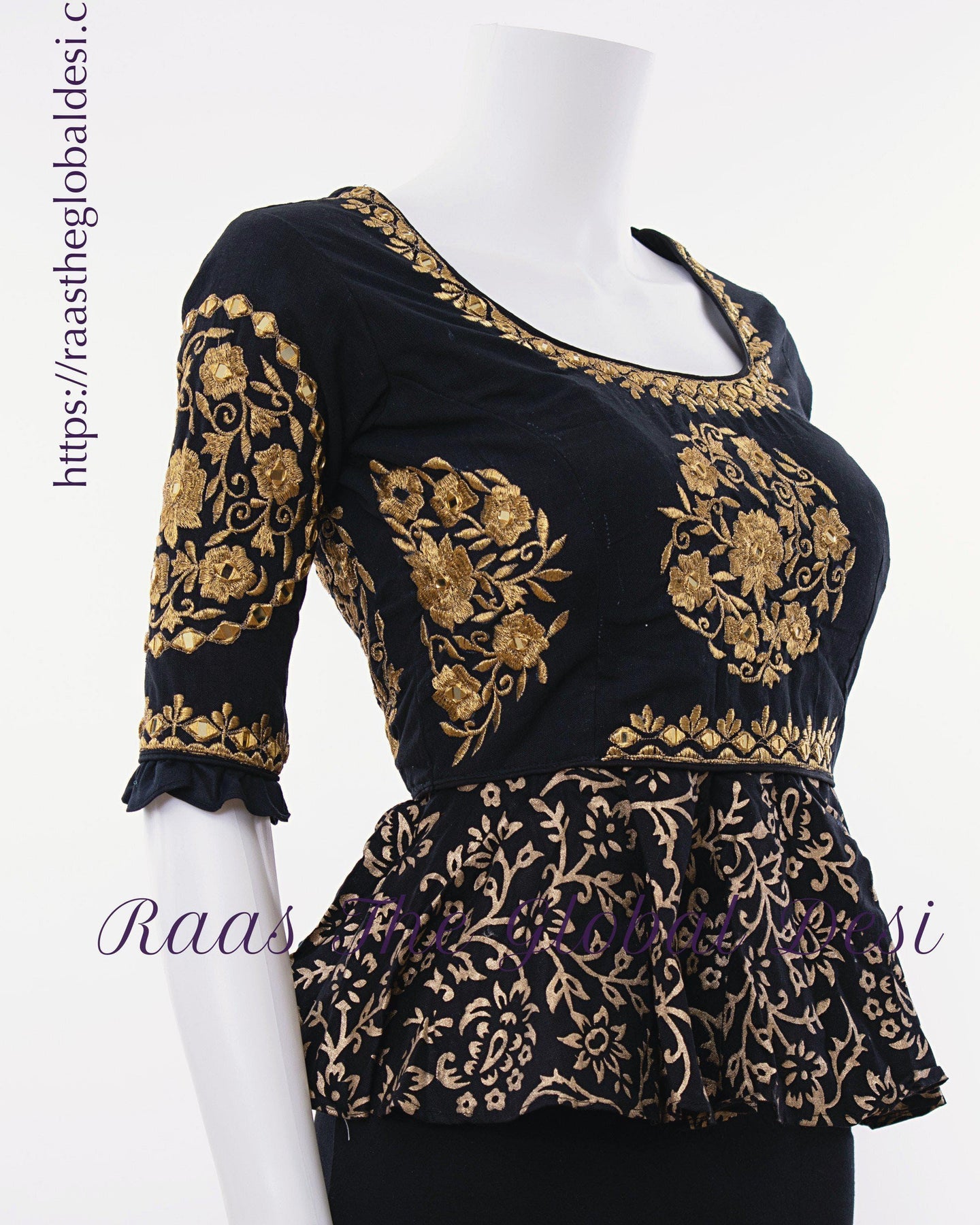 Update your wardrobe staple with this exquisite designer peplum Silk blouses with stylish embroidery  work Blouse. This royal black blouse can go with anything and everything!