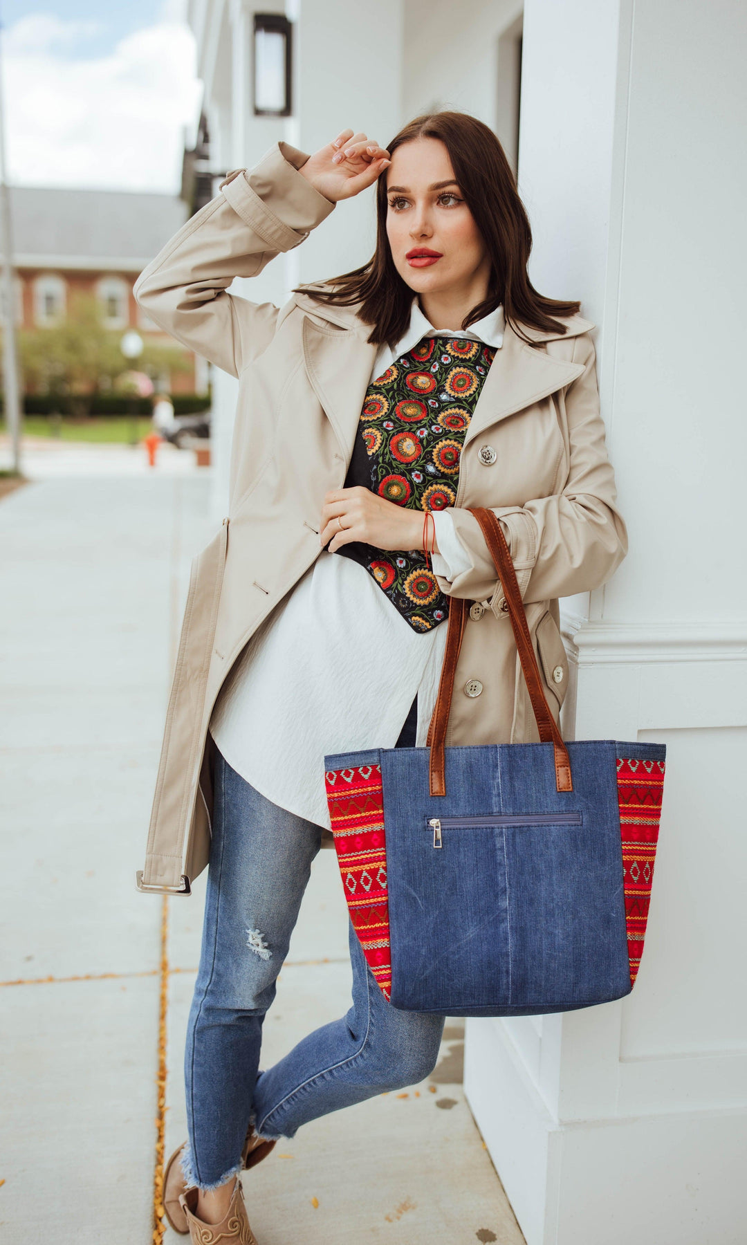 the style is the large tote may be carried by hand or worn over the shoulder. Add matching sling bag and spectacle cover. The CARA denim tote with sling bag and spectacle case is a perfect everyday tote for women.The bag has accents of color with contrasting blue denim at the centre and embroidered on the side.