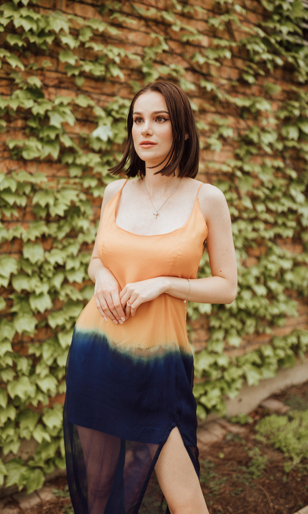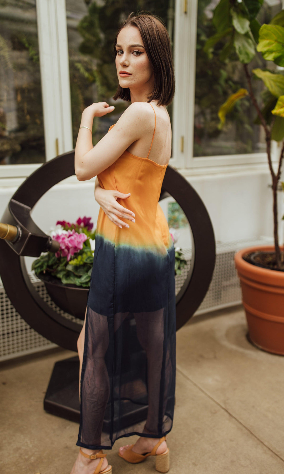 The Chiara Long Dress with Slit is an exquisite piece, crafted from flowing georgette. Featuring a stunning ombre effect that transitions from a beautiful shade of peach to blue, this long dress exudes elegance while being charming. The half-lined design and graceful slit add a modern and airy touch, making it perfect for any special occasion.