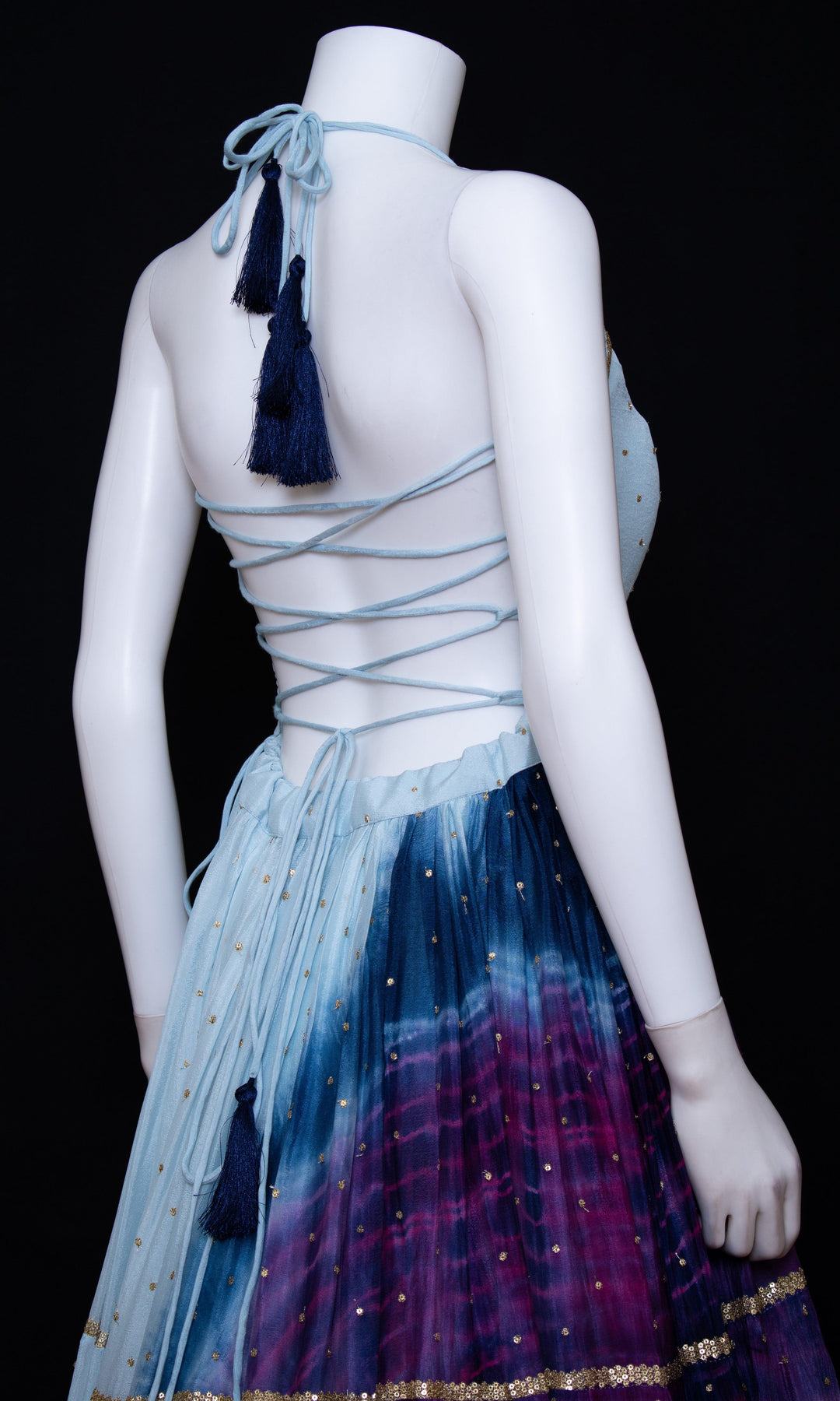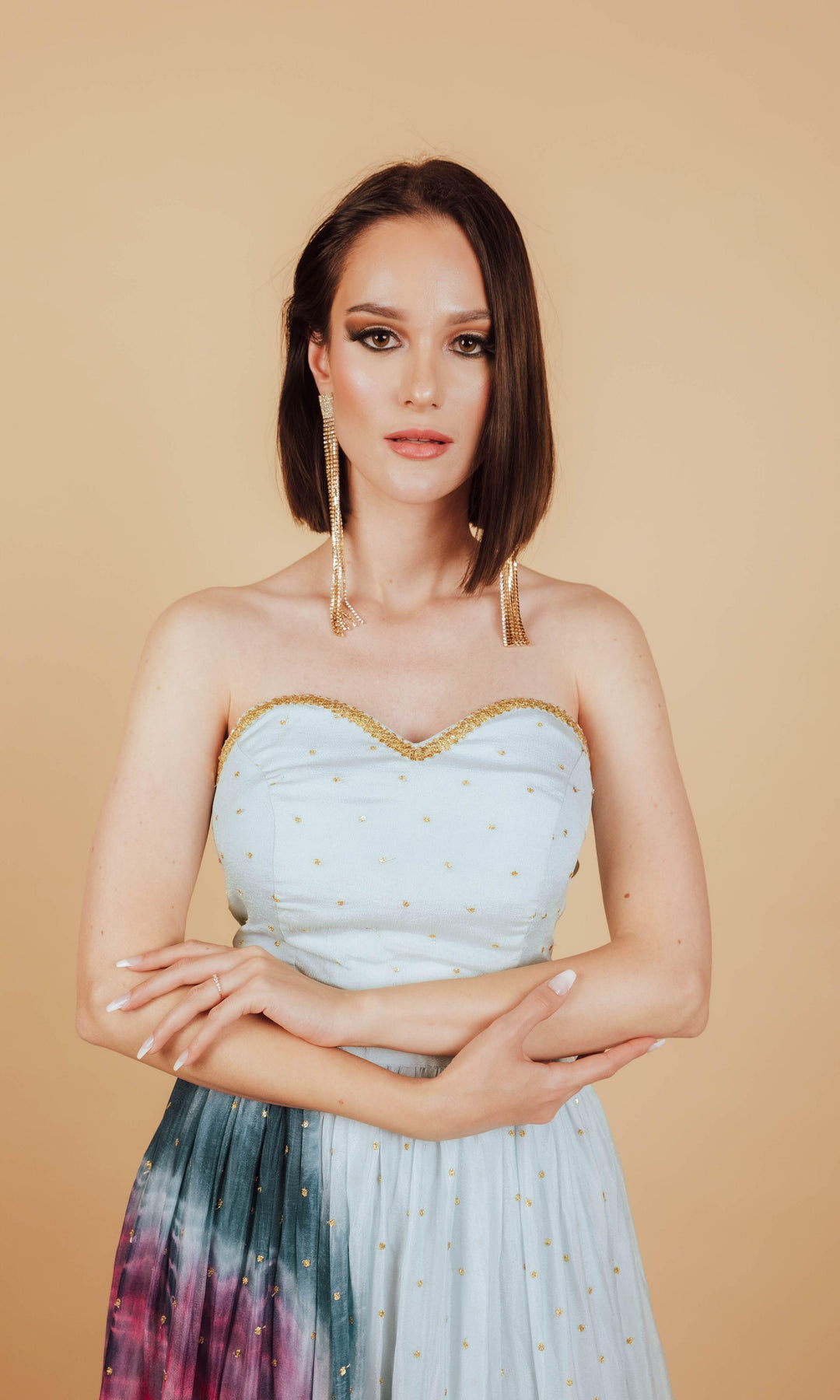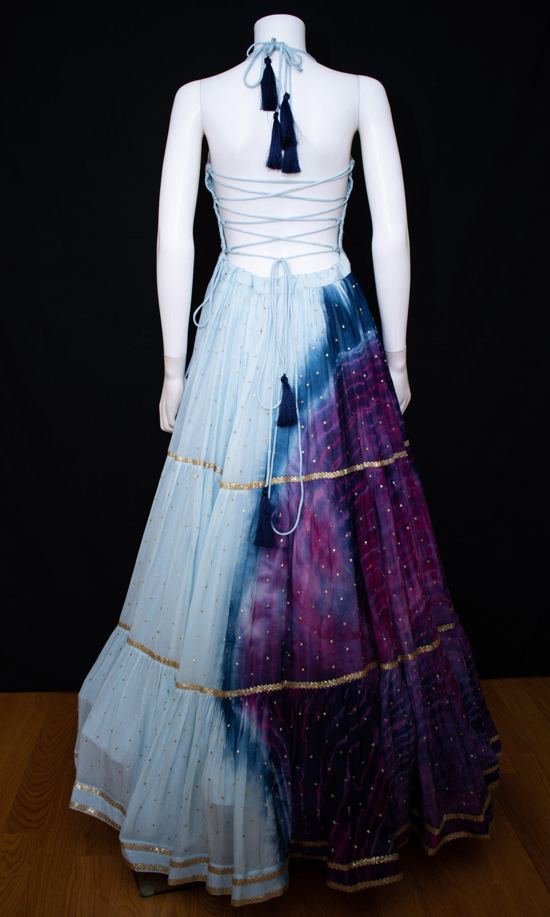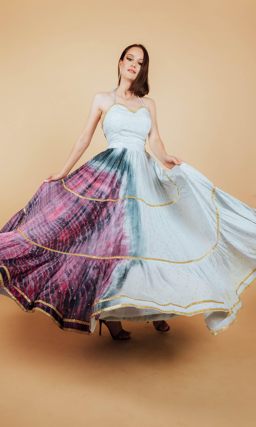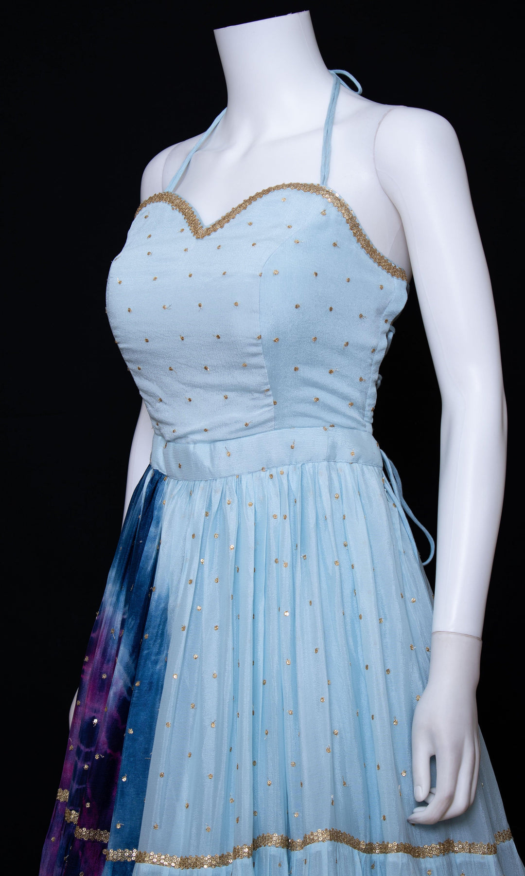 Embrace effortless elegance with the Cordelia Long Dress, a perfect blend of modern charm and traditional artistry. This sky-blue tiered dress is crafted from luxurious chinon fabric and adorned with intricate all-over sequins embroidery, creating a stunning shimmer effect. Hand tie-dye detailing adds a subtle contrast, making it perfect for any occasion where you want to stay subtle but still make a statement with its intricate sequins work and artistic tie-dye accents.