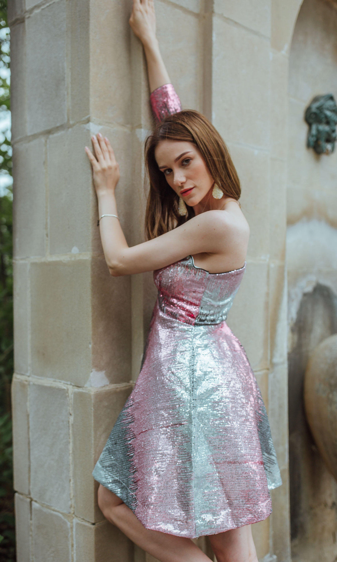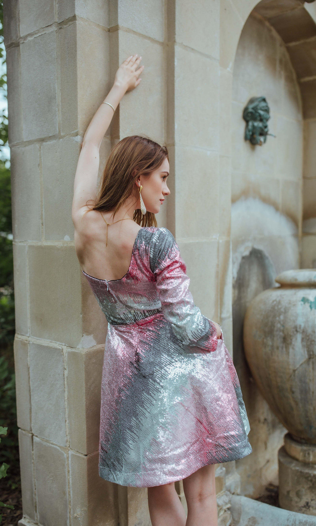- Specifications: Fully lined, sleeveless, mini silhouette, all-over sequins embroidery, one shoulder, back zipper