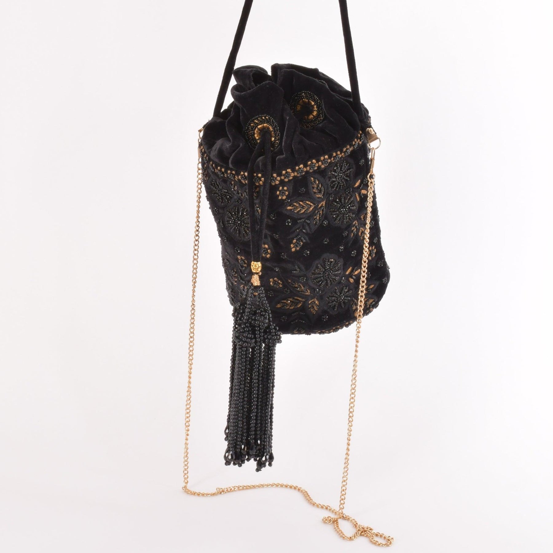 An exquisite blend of elegance and craftsmanship, the Brielle Black Floral Embroidered Bucket Bag is a statement piece designed to captivate. Crafted from luxurious velvet, this bucket bag is adorned with intricate hand embroidery featuring resham, bead, and kasab work. The delicate bead hangings add movement and charm, while the metallic hanging chain lends a touch of sophistication.