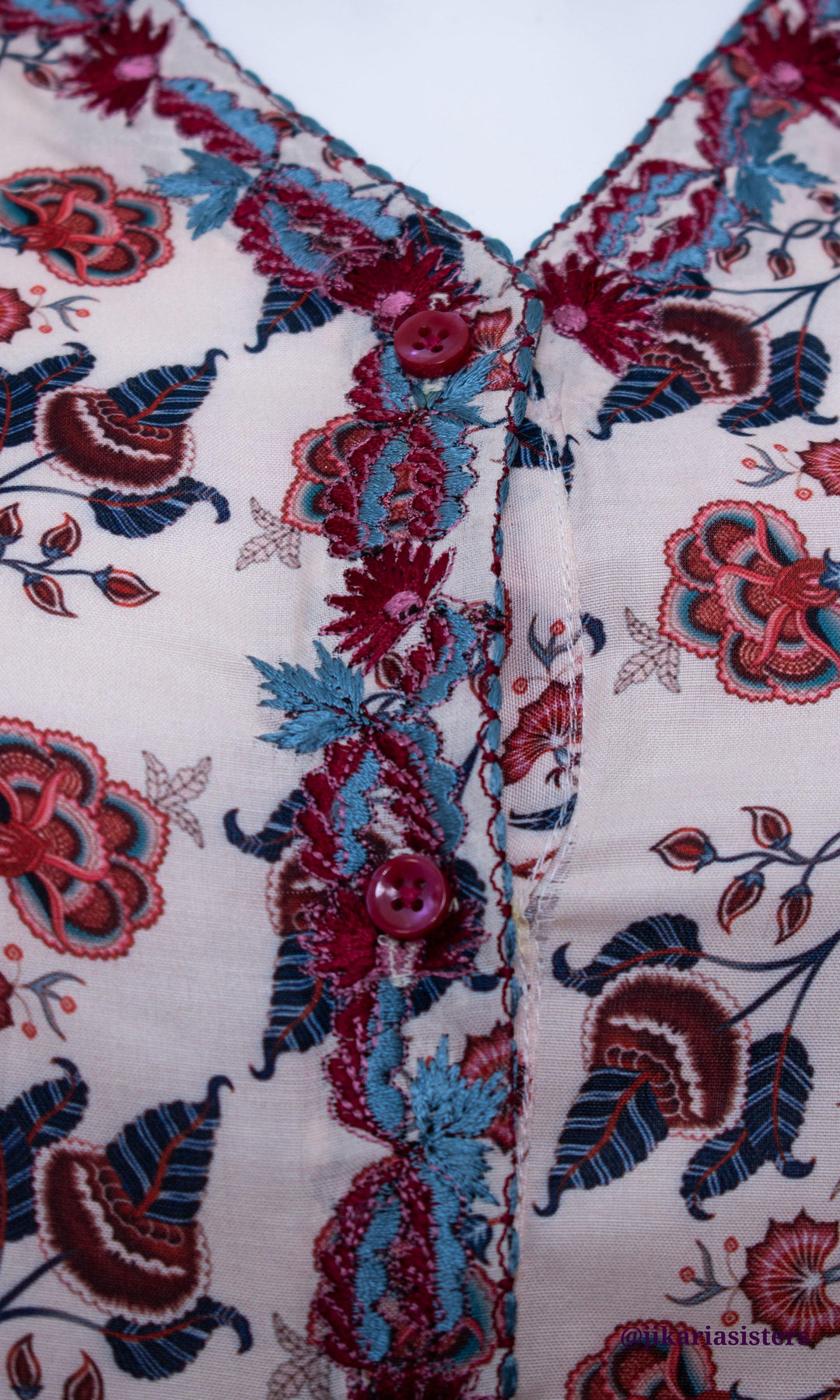 - Specifications: Regular fit, high neck, cap sleeves, floral embroidery, all-over hand-block dhabu print, front closure