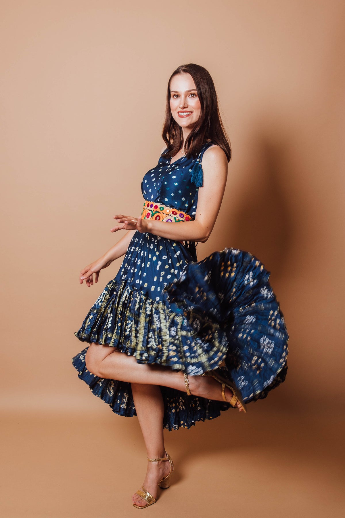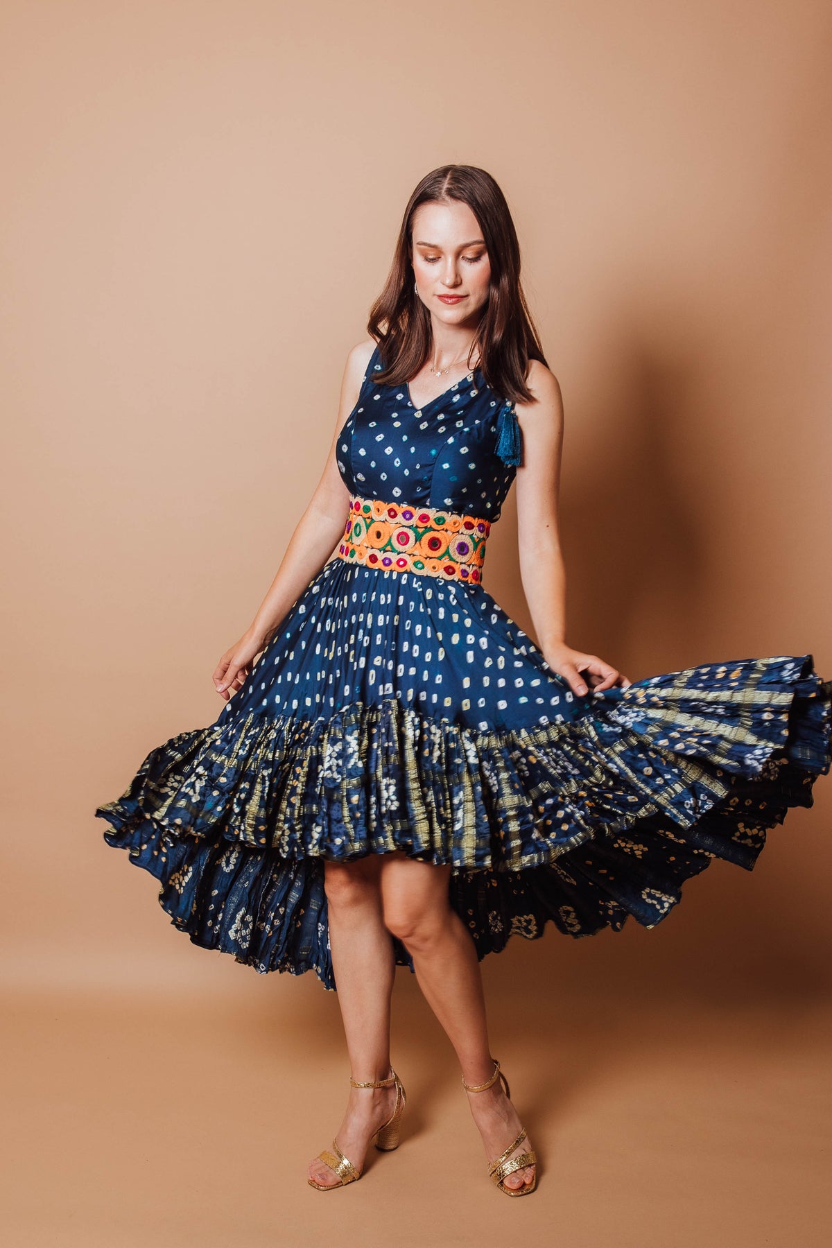 Exquisitely handmade from premium gaji silk, this Evelyn dress boasts a high-low silhouette with all over hand bandhej detailing. Elevated with a traditional kutch embroidered belt, This piece harmoniously blends modernity and Indian design for a luxurious, yet comfortable feel, perfect for special occasions like homecoming, parties, and mehndi.