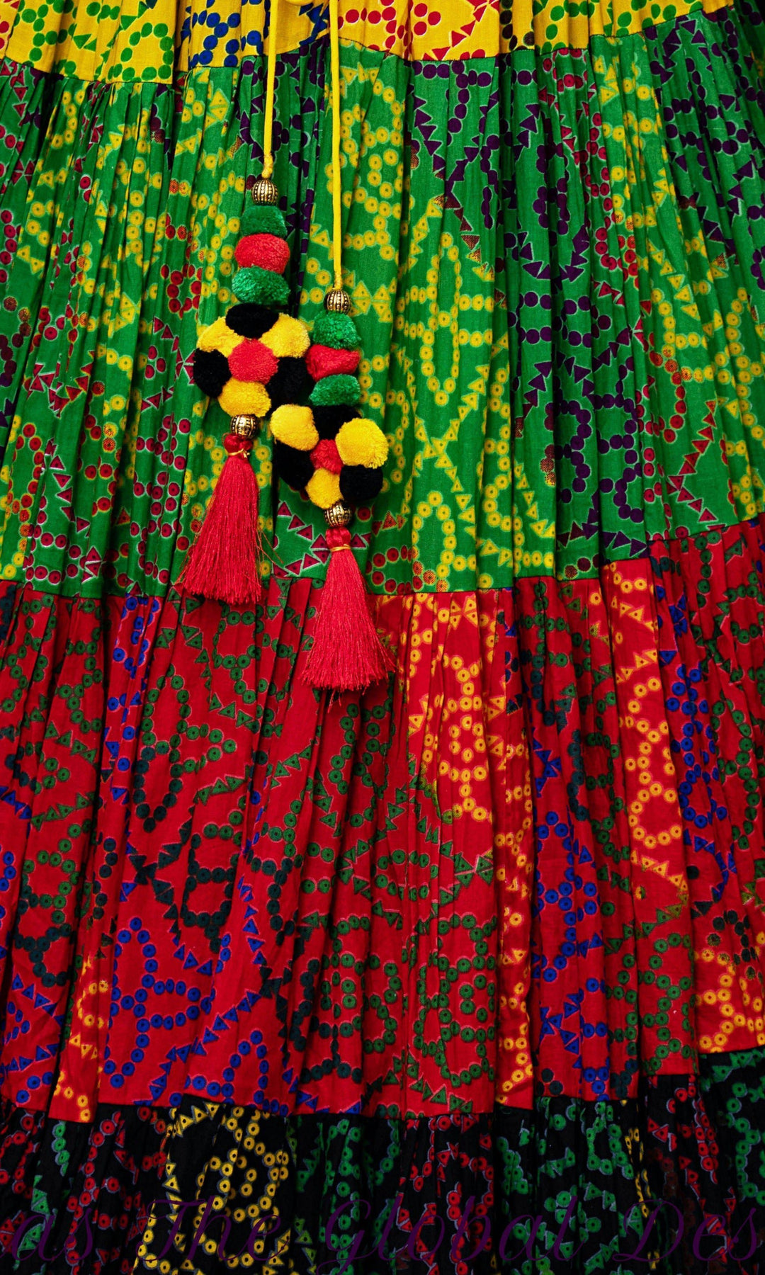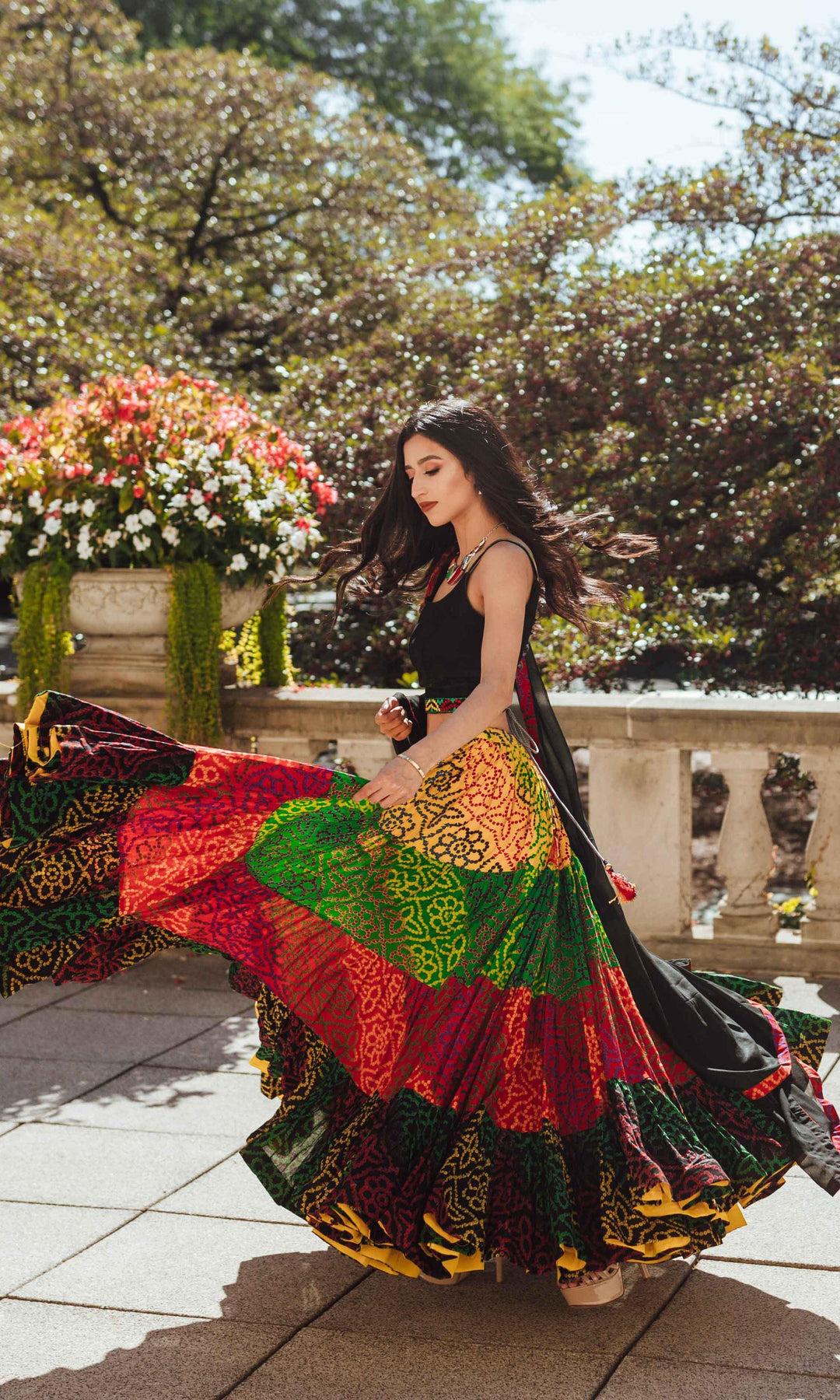 Awaken the diva within you and grab the spotlight with the stunning Bandhej chaniya choli from our newest collection. Featuring a breathtaking 45-meter flare, this lehenga combines vibrant tropical colors with traditional ethnic prints, offering both comfort and style. Crafted from high-quality cotton, the lehenga is designed with a tiered A-line silhouette, each tier showcasing cheerful tropical hues enhanced by intricate Bandhej prints.