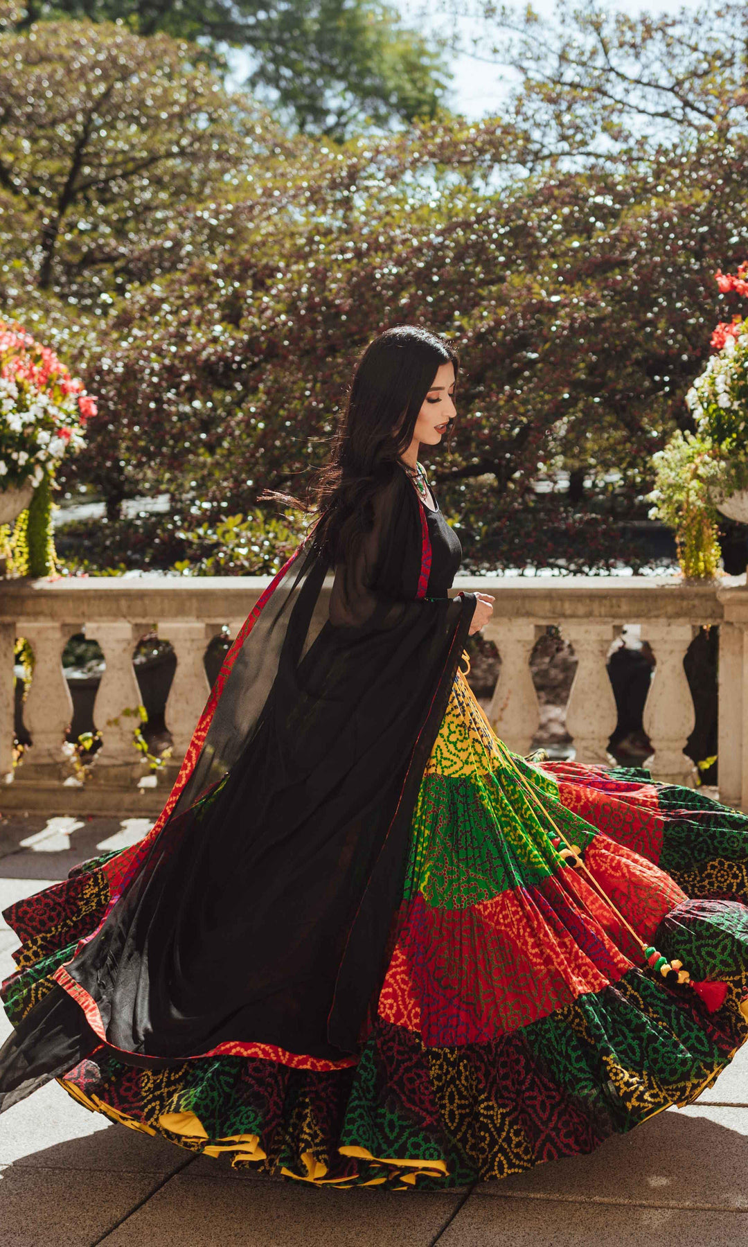 The black choli is beautifully embroidered with colorful embellishments along the straps and base, perfectly complementing the vibrant chaniya choli. Paired with a black georgette dupatta, adorned with delicate Bandhej lace accents, this outfit radiates elegance and modern charm.