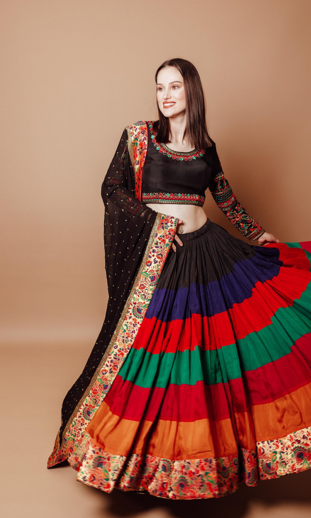 This Cruz Multi-Color Chaniya Choli radiates grace. The lehenga, crafted from luxurious silk, features delicate embroidery and shimmering sequins, while the blouse, also made from silk, is adorned with intricate handwork. The georgette dupatta, featuring all-over sequin work and a Banarasi jacquard border, adds an air of royality. Ideal for weddings or grand celebrations, this Chaniya Choli set effortlessly showcases a perfect blend of opulence.